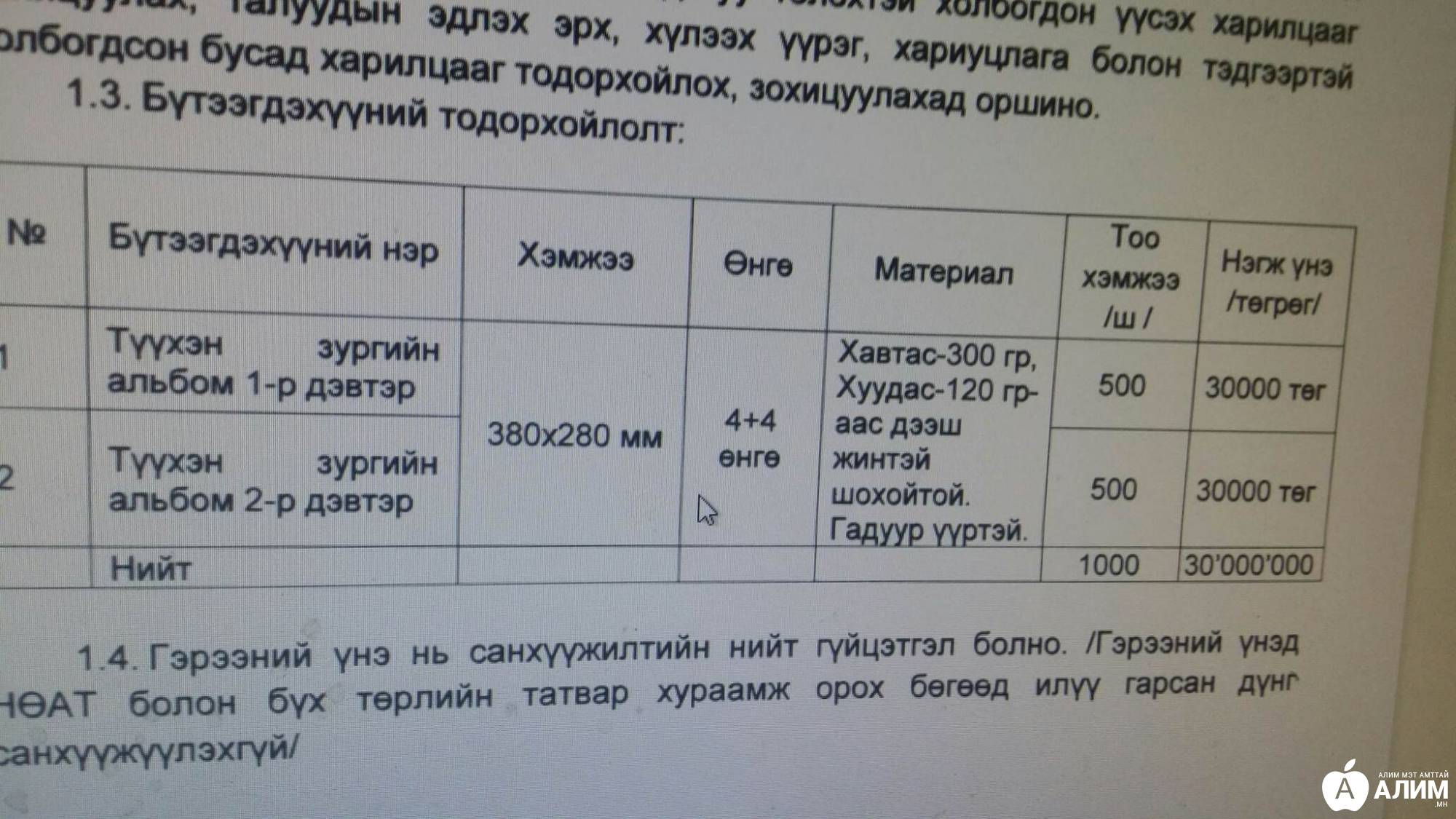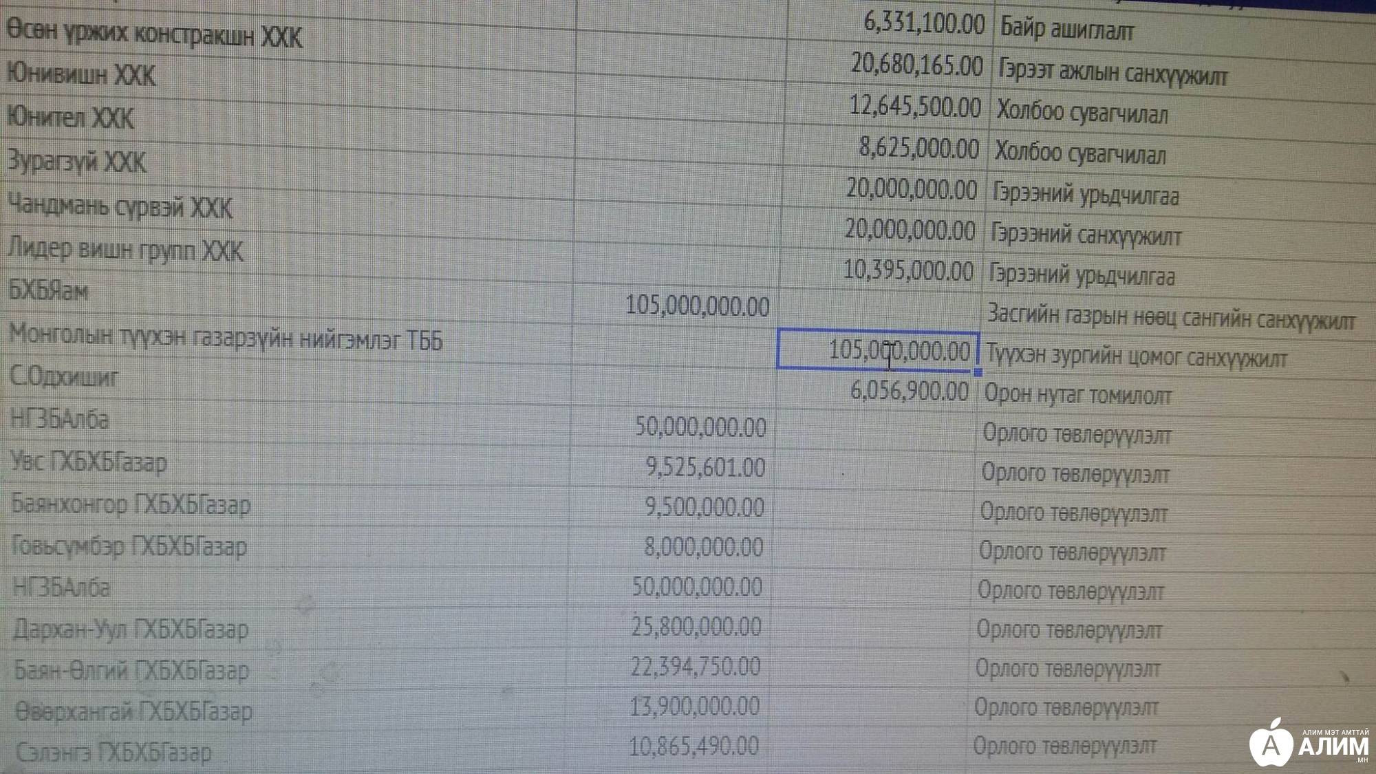Газар зохион байгуулалт, геодези, зураг зүйн газар нь “Монголын түүхэн газарзүйн нийгэмлэг” ТББ-тай “Монголын түүхэн зургийн цомог” хийлгүүлэхээр гэрээ байгуулжээ. Ийм ажил хийж хийлгүүлж болох нь мэдээж. Гэхдээ энэ ажлын хөлсөнд Газар зохион байгуулалт, геодези, зураг зүйн газраас 105 сая төгрөг гарсан бол гэрээ дээр нь 30 сая төгрөг гэж тохиролцсон байх юм. Улмаар гэрээний үнэ нь санхүүжилтийн нийт гүйцэтгэл болно гэж заажээ. Тэгэхээр гэрээний дүн нь 30 сая төгрөг болж таарна. Мөн гэрээнд зааснаар “Монголын түүхэн газарзүйн нийгэмлэг” ТББ урьдчилгаа 30 хувийг эхэлж авах бөгөөд гэрээт ажлаа хийж гүйцэтгэсний дараа үлдэгдэл 70 хувиа авахаар тохиролцсон. Гэтэл шилэн дансны мэдээлэлд шууд 105 сая төгрөг гарчээ. Үүнээс илүү гарсан 75 сая төгрөг хаашаа орсоныг Газар зохион байгуулалт, геодези, зураг зүйн газрын дарга Ц.Ганхүү, “Монголын түүхэн газарзүйн нийгэмлэг” ТББ-ын Удирдах зөвлөлийн дарга Г.Бадамсамбуу нар тайлбарлах биз ...