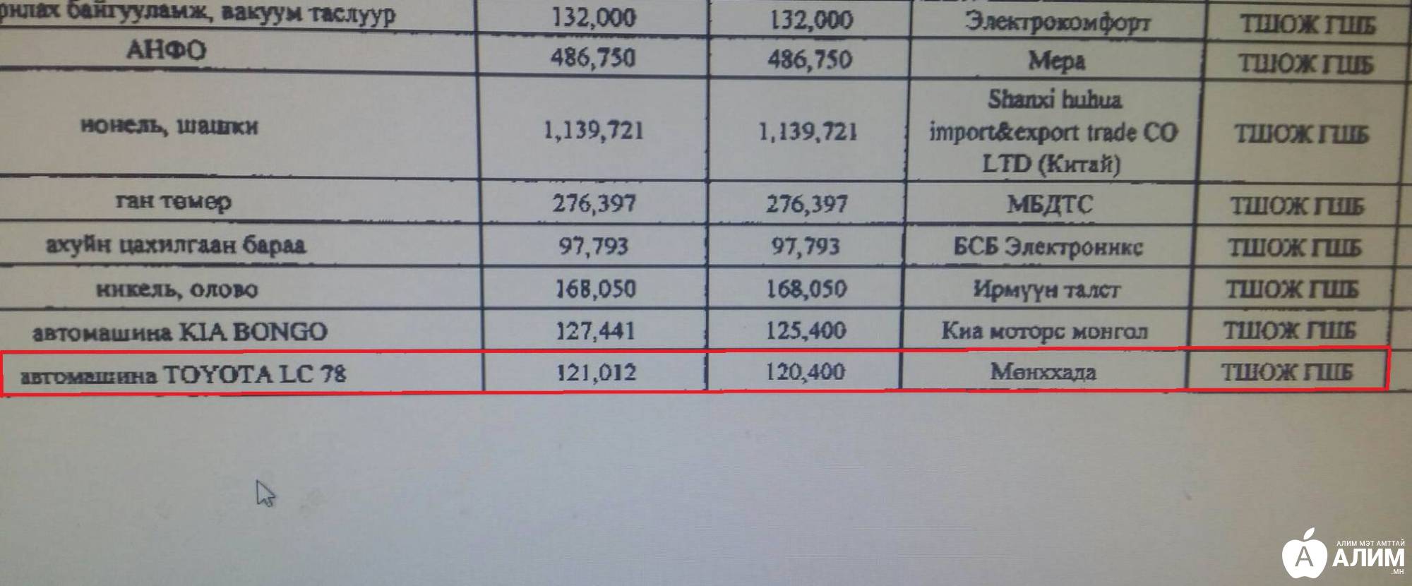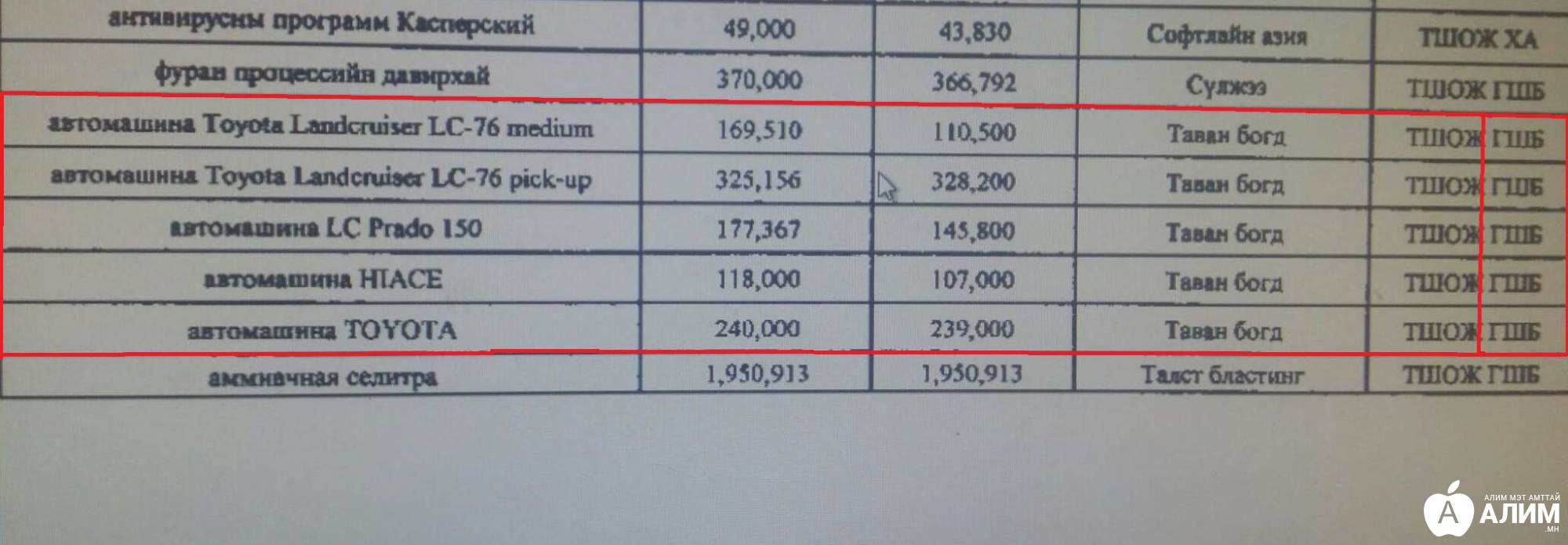 Энэ нь тус үйлдвэрийн 2019 онд хууль зөрчин шууд гэрээ байгуулах аргаар худалдаж авсан 471 тэрбум төгрөгийн бараа ажил, үйлчилгээний өчүүхэн хэсэг юм. Өнгөрсөн онд “Таван богд” компанид хамгийн их орлого оруулсан “буянтан” нь төрийн өмчит “Эрдэнэт” үйлдвэр болсон. Нийтдээ 930 гаруй сая төгрөгийн худалдан авалт авах хийсэн гэхээр аргагүй биз. Мөн мөнгөтэй айл шиг даналзаж хамгийн үнэтэйгээс нь шилжээ. “Ландкруйзер LC 76 pick-up” загвараас 328,2 сая төгрөгөөр худалдан авчээ. Хэдэн ширхэгийг авсан, одоо хэн гэдэг дарга унаж байгааг “Эрдэнэт”-ийн удирдлага л мэдэх байх. 136-170 сая төгрөгийн үнэтэй “LC Prado” загвараас 145,8 сая төгрөгөөр бодвол нэгийг худалдан авсан байна. 110-128 саяар зарагдаж байгаа “HIACE” загвараас 107 сая төгрөгөөр бас худалдан авсан байна. Жагсаалтын хамгийн сүүлд загварыг нь тодорхой бичээгүй “тоёото” гэдэг машиныг 239 сая төгрөгөөр худалдан авчээ. “Таван богд” компани “ланд200”-гаа л иймэрхүү үнээр зардаг. Монголд “Тоёото” компанийн тансаг зэрэглэлийн машиныг “Мөнхада” компани мөн оруулж ирдэг. “Эрдэнэт”-ийн дарга нар адилхан хоёр борлуулагчийг алагчилалгүйгээр тус компаниас мөн 120 саяар нэг машин худалдаж авчээ. Жагсаалтад худалдан авсан арга хэлбэрийг “гэрээ шууд байгуулах” буюу “ГШБ” гэж бичжээ. Энэ худалдан авалт тус үйлдэрийн 2019 оны шилэн дансны мэдээлэлд ороогүй. Худалдаж авсан машины загвар, үнэ зэргээс харахад “Эрдэнэт”-ийн удирдлагын багийн гишүүн бүр унаагаа юүлсэн гэмээр дүр зураг харагдаж байна.