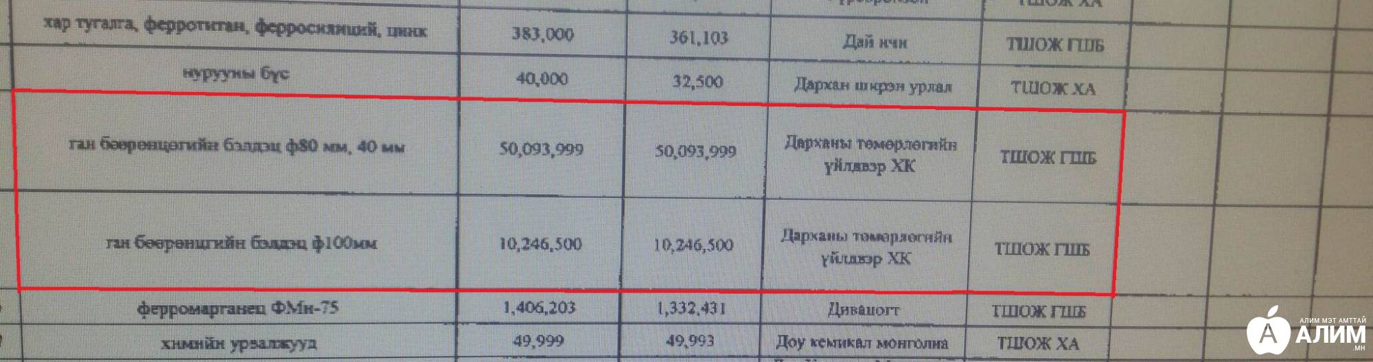 Өнгөрсөн оны “Эрдэнэт” үйлдвэртэй байгуулсан шууд гэрээний аваргаар Дарханы төмөрлөгийн үйлдвэр тодорчээ. Энэ үйлдвэр ган бөөрөнцөгийн бэлдмэл нийлүүлэх 60 тэрбум төгрөгийн гэрээг шууд байгуулсан байна. Дарханы төмөрлөгийн үйлдвэр "Эрдэнэт”-ийн ган бөөрөнцөгийн нийлүүлэлтэнд дангаараа ноёрхдог гэхэд болно. “ОРА металл” компани 10 гаруй тэрбумын ган бөөрөнцөг нийлүүлсэн нь хажууд нь жижигхэнд тооцогдоно. Хоёр аварга ханцуй дотроо наймаалцаж байгаа үед тендер зарлах, шалгаруулах гэх мэт хууль журам яригдахгүй нь мэдээж. “Эрдэнэт” үйлдвэрт “ТШОЖ” буюу “тендер шалгаруулах онцгой журам” үйлчилдэг. Үүгээр халхавчилан хуулийн дагуу сонгон шалгаруулалт явуулгүйгээр шууд гэрээлж эсвэл худалдаж авдаг гэнэ.