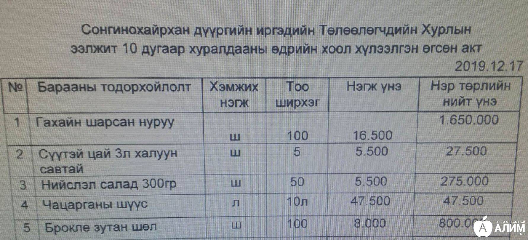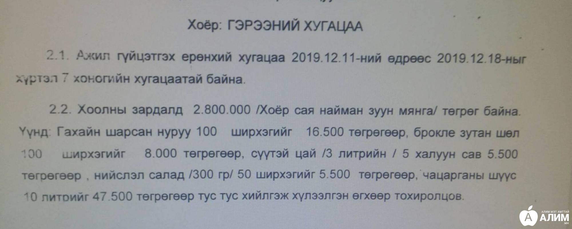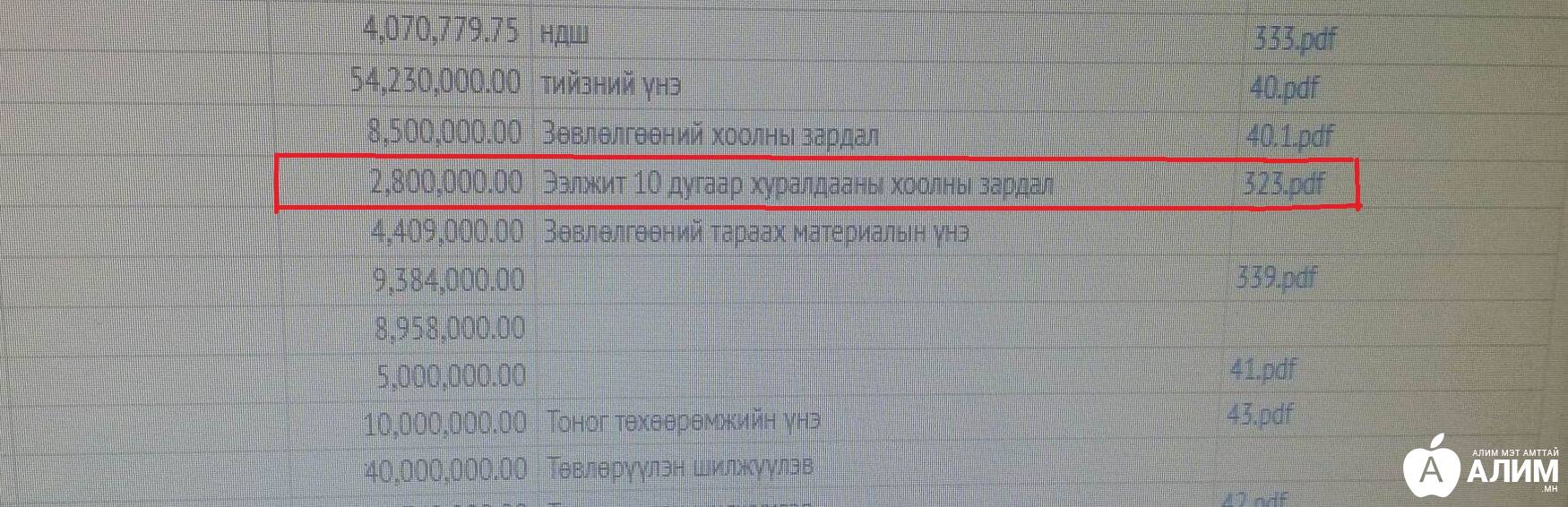 Энэ бол 2019 оны 12-р сард Сонгинохайрхан дүүргийн ИТХ-ын төлөөлөгчид ээлжит 10-р хуралдаандаа тансагласан баримт юм. Нийт 41 төлөөлөгчтэйгээс МАН 39, АН хоёр суудалтай агаад ээлжит хуралдаан долоо хоног үргэлжилжээ. Энэ хугацаанд төлөөлөгчид хоолны өмнө нэг бүр нь 5500 төгрөгний үнэтэй нийслэл салад 50 ширхэгийг тамшаалан хооллох дуршлаа өдөөжээ. Одоо ч энэ мөнгөөр 2-р хоол идэж болох тул төлөөлөгчид хоолны үнэтэй салат зооглосон байна. Үүний даараа 1-р хоолонд найман мянган төгрөгний үнэтэй брокле зутан шөл зуун ширхэгийг “цохижээ”. 2-р хоолонд хоолны тансаг хүлээн авалтын ширээг чимдэг гахайн шарсан нуруу ирсэн. Төлөөлөгчид нэг бүр нь 16500 төгрөгний үнэтэй 100 ширхэг гахай шарсан нурууг “цааш нь харуулжээ”. Энэ мөнгө бол хотын төвийн том зоогийн газрын цэсний ханш юм. Дээрх бүх хоол зууш тэргүүтнийг 15 литр сүүтэй цайгаар даруулжээ. Ханиад томууны улиралд хуралдсан тул 10 литр чацарганы шүүсээр “дархлаагаа дэмжсэн” байна. Энэ бүх хоолонд нийтдээ 2,8 сая төгрөг зарцуулсаны дээр төлөөлөгчид хуралдааны завсарлагаагаар кофе, ундаа, жигнэмэг гээд 900 мянган төгрөгний амттан тэргүүтэн хүртжээ. Ингээд нийтдээ 3,7 сая төгрөгийг ийнхүү хэдэн төлөөлөгч хэдхэн хоногт идэж уугаад дуусгасан аж. Дээрхи мөнгө нь зөвхөн нэг хуралдааны хоолны зардал бөгөөд дөрвөн жилийн хугацаанд хуралдахдаа хичнээн төгрөгийн хоол унд идсэнийг ёстой таашгүй. Уг нь төлөөлөгчдийг идээд ир гэж сонгоогүй, ажиллаад ир гэж сонгосон юмсан. Иргэд нь хоолны махгүй хонож байхөд төлөөлөгчид нь төсвийн мөнгөөр арааны шүлс асгаруулам гахайн шарсан нуруу зооглож суужээ. Сонгинохайрхан дүүрэг нь хамгийн олон хүнтэй, ядуурлын түвшин өндөртэй гэдэг. Одоогийн ХЗ-н сайд Х.Нямбаатар ИТХ-ын дарга байхдаа том дүүрэгт бага төсөв тавилаа хэмээн байнга гомдоллодог байсан. Тэгвэл тавигдсан төсвийг нь ИТХ-ын эрхэм төлөөлөгчид ингэж л жорлонд “тушааж” иржээ. Тухайн үед дүүргийн ИТХ-ын даргаар Б.Мөнхцэцэг ажиллаж байсан.