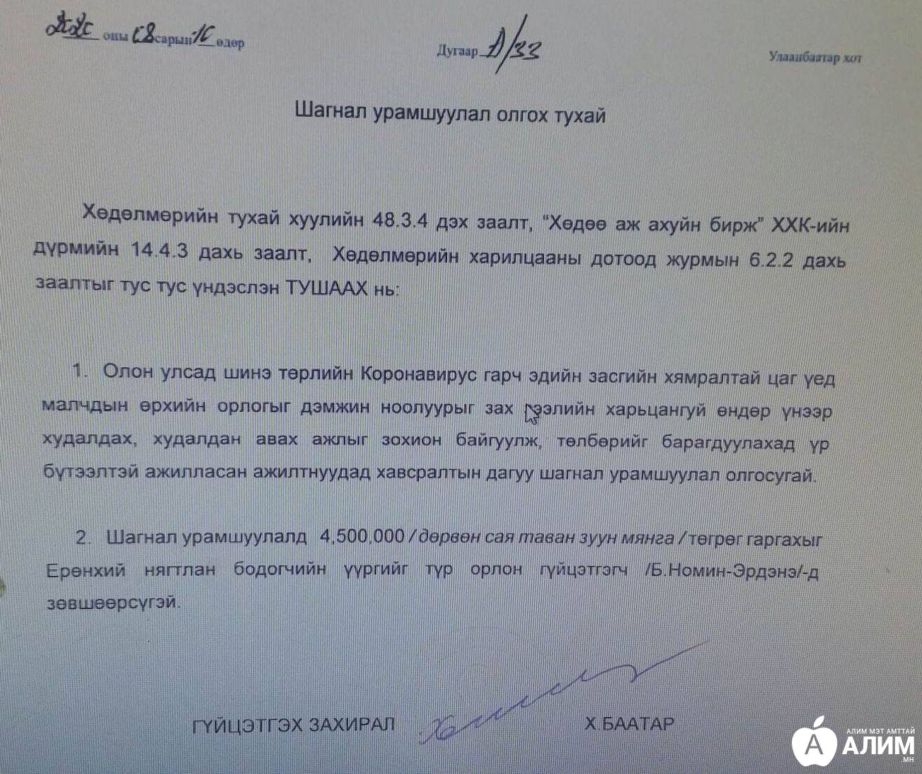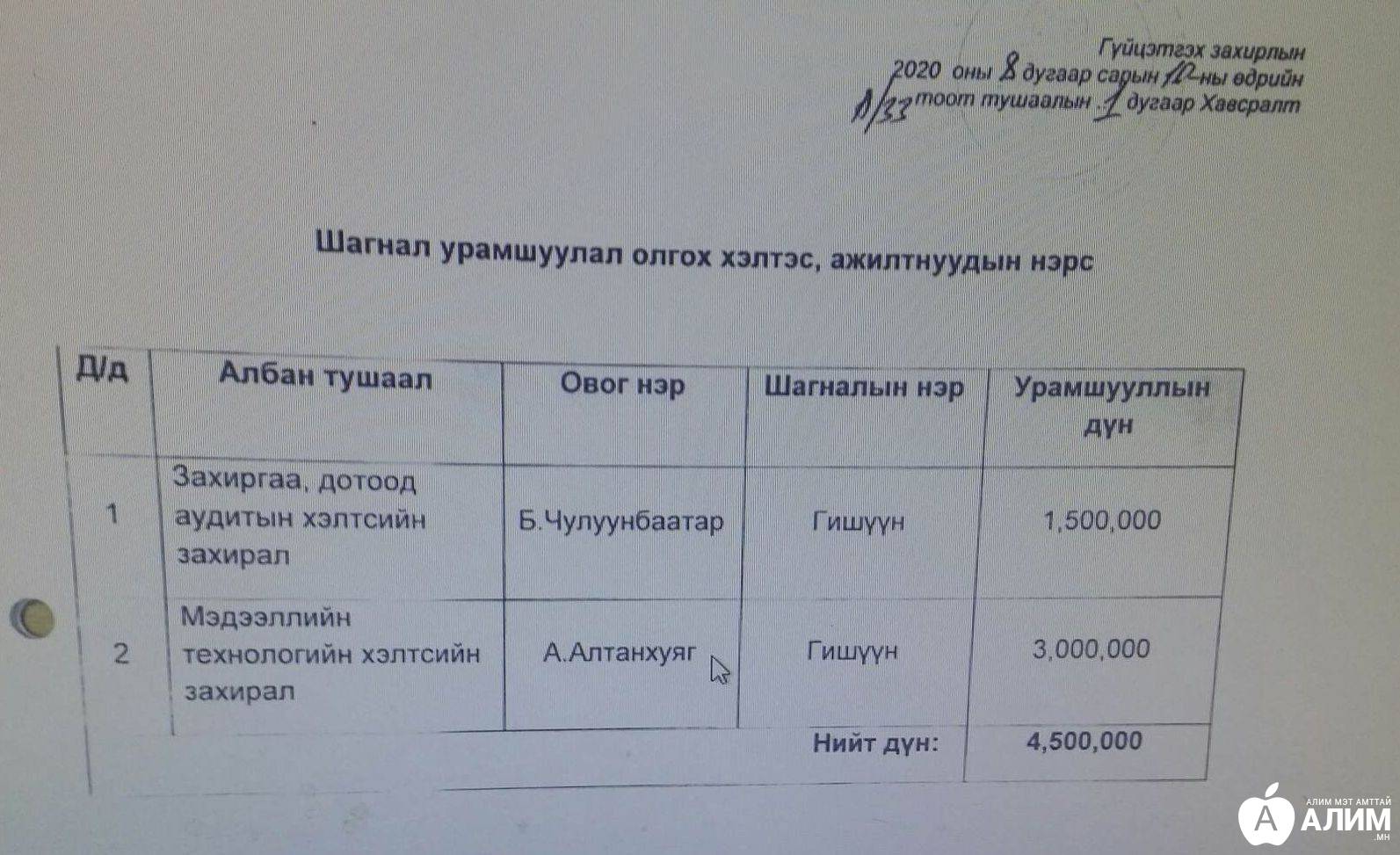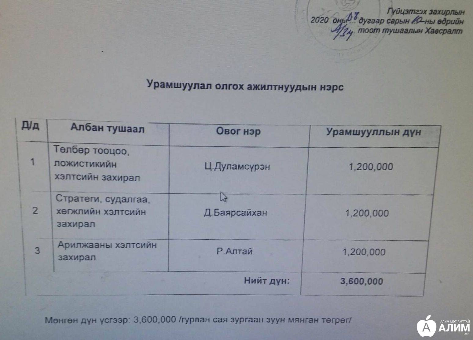 “Гаалийн” хэмээх Х.Баатар Хөдөө аж хуйн биржийг ихээхэн шуугиантай удирдаж байна. Энэ байгууллага гаднаа ч хэл амтай, дотроо ч хэл амтай явна. Дотоод шуугианы нэг нь энэ оны 8-р сарын 10-д гүйцэтгэх захирал Х.Баатар гэнэтхэн удирдлагын багаа нийтдээ 8,1 сая төгрөгөөр шагнасан явдал юм. Үүнд цар тахлын үед ноолуурыг зах зээлээс харьцангуй өндөр үнээр авах ажилд үр бүтээлтэй ажилласан хэмээн Захиргаа дотоод аудитын хэлтсийн захирал Б.Чулуунбаатараа 1,5 сая, Мэдээлэл технологийн хэлтсийн захирал А.Алтанхуягаа бүр гурван сая төгрөгөөр шагнажээ. Шагналын хэмжээнээс харахад нэг дарга нь нөгөөгөөсөө нэг дахин сайн ажилласан болж байна. Гэхдээ хаврын ноолуурыг 100 мянган төгрөгөөр авах ажиллагаа ихээхэн хэл ам, маргаан дагуулж өндөрлөсөн. Х.Баатар мөн энэ өдрөө ахин тушаал гаргаж удирдлагын багийн үлдсэн гурван дарга, захирлаа бас шагнажээ. Эхний хоёр дарга ноолууранд сайн ажилласан хэмээн шагнуулах шалтгаантай байсан бол нөгөө гурван даргаа зүгээр л “идэвхи санаачилгатай, үр бүтээлтэй ажилласан” хэмээн урамшуулсан байна. Ингээд Төлбөр тооцоо ложистикийн хэлтсийн захирал Ц.Дуламсүрэн, Стратеги, судалгаа хөгжлийн хэлтсийн захирал Д.Баярсайхан, Арилжааны хэлтсийн дарга Р.Алтай нараа хэн нь ч гомдож барьцахгүйгээр тэнцүүхэн 1,2 сая төгрөгөөр шагнажээ. ЖДҮ-чин УИХ-ын гишүүд бүгд 950 сая төгрөг авсан шиг энэ гурван дарга нартаа ижил хэмжээний шагнал өгсөн нь цаанаа учиртай биз. Ийнхүү нэг өдөрт багтаан нийт дарга, захирлаа шагнасан нь Х.Баатар тэдэндээ машид сайнаар ханддагийн “илэрхийлэл” гэхэд болох байх. Удирдлагын баг нь ч Х.Баатар захирлынхаа энэхүү далай мэт хайр халамжийг хөдөлмөрийн өндөр амжилтаар хариулж буй биз ...