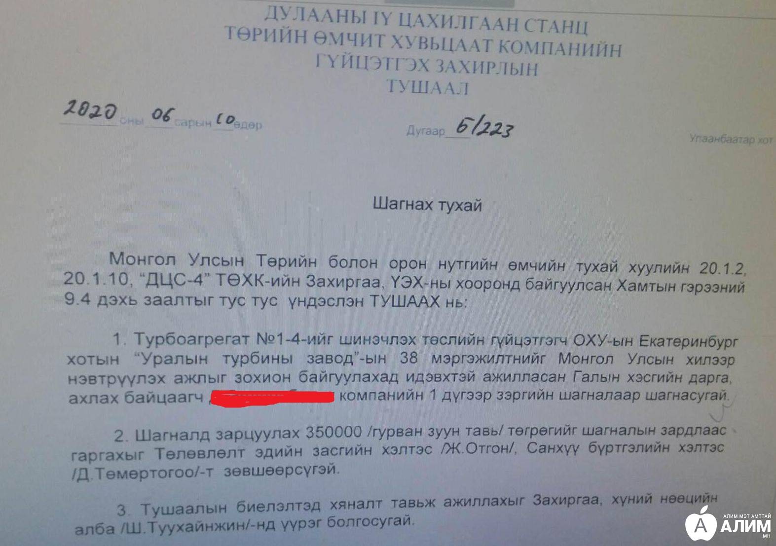 “ДЦС-4” ТӨХК-ийн захирал орос ажилчдыг оруулж ирэхэд идэвхтэй ажилласан ажилтнаа 350 мянган төгрөгөөр шагнажээ