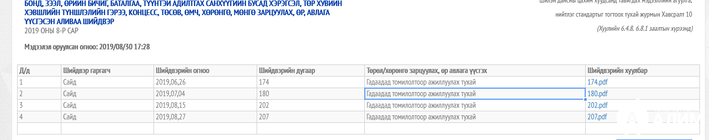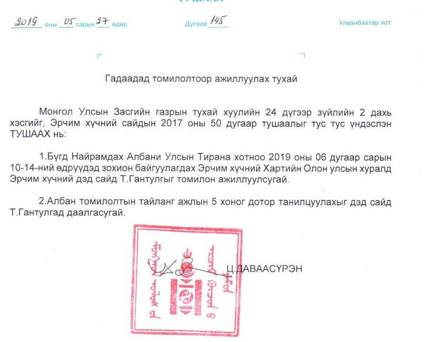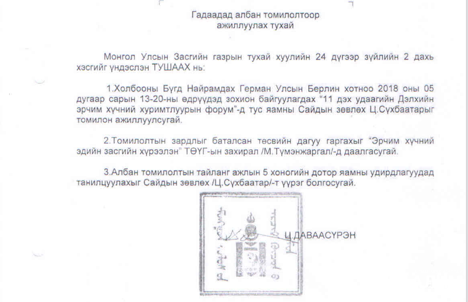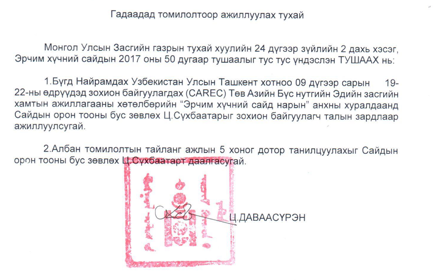 7, 2019 оны 9-р сарын 12-нд Казакстанд тус томилолтоор ажиллажээ. Харин Ц.Даваасүрэн сайдын орон тооны бус зөвлөх Ц.Сүхбаатар яамны дарга нараас ч олон удаа гадаад томилолт авчээ. Тэрээр :