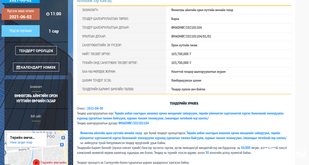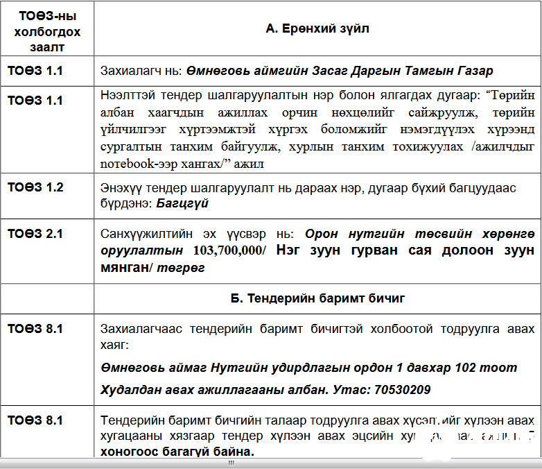 Хэдхэн сарын өмнө Өмнөговь аймгийн ИТХ-ын дарга Б.Бадраа 257 сая төгрөгөөр “LEXUS 570” загварын автомашиныг улсын төсвийн хөрөнгөөр худалдаж авахаар тендер зарлаж шуугиан тарьж байсан. Тэгвэл Засаг дарга Р.Сэддорж түүний араас оржээ. Аймгийн ЗДТГ-ын захиалгаар “Төрийн албан хаагчдын ажиллах нөхцлийг сайжруулж, төрийн үйлчилгээг хүртээмжтэй хүргэх боломжийг нэмэгдүүлэх хүрээнд сургалтын танхим байгуулж, хурлын танхим тохижуулах/ажилчдыг нотебүүкээр хангах/” гэсэн 103 сая төгрөгийн өртөгтэй тендер зарлажээ. Урт нэртэй гарчигнаас л харахад хурлын танхим тохижуулах, эсхүл нотебүүкжүүлэх гээд байгаа эсэхийн аль нь болох нь мэдэгдэхгүй байна. Эхнээсээ хардлага төрүүлсэн энэ тендер нь цаашаа бүр сэжигтэй агаад техникийн баримт бичиг нь зориуд санаатай хийгдсэн юм уу гэмээр бүрхэг тодорхой бус аж. Тендерийн баримт бичгийн техникийн тодорхойлолтонд авах гэж буй бараа, үйлчилгээний нэр төрөл, хэлбэр, тоо ширхэг, техникийн үзүүлэлтийг нарийн тодорхой бичдэг журамтай. Гэтэл Өмнөговийн энэ тендерийн техникийн тодорхойлолтын хэсэг нь хоосон агаад ер нь ямар ажил үйлчилгээ авах гээд байгаа талаар үг, өгүүлбэр алга байна. Хэрвээ хурлын танхим тохижуулах гэж буй бол зураг төсөл нь байх ёстой ч алга. Мөн нотебүүк худалдан авах гэж буй бол техникийн үзүүлэлтийг нь оруулах учиртай ч тэр нь мөн байхгүй. Ийм нэгэн сэжигтэй тендерийг 103 сая төгрөгөөр зарлажээ. Засгийн газрын хуралдаанаар төрийн байгууллага, төрийн өмчит компаниуйдыг автомашин тавилга, тоног төхөөрөмж худалдан авах, урлаг соёлын арга хэмжээг ивээн тэтгэхийг хориглосон ч энэ заалт хөдөө орон нутагт иймэрхүү хэрэгжиж байна.