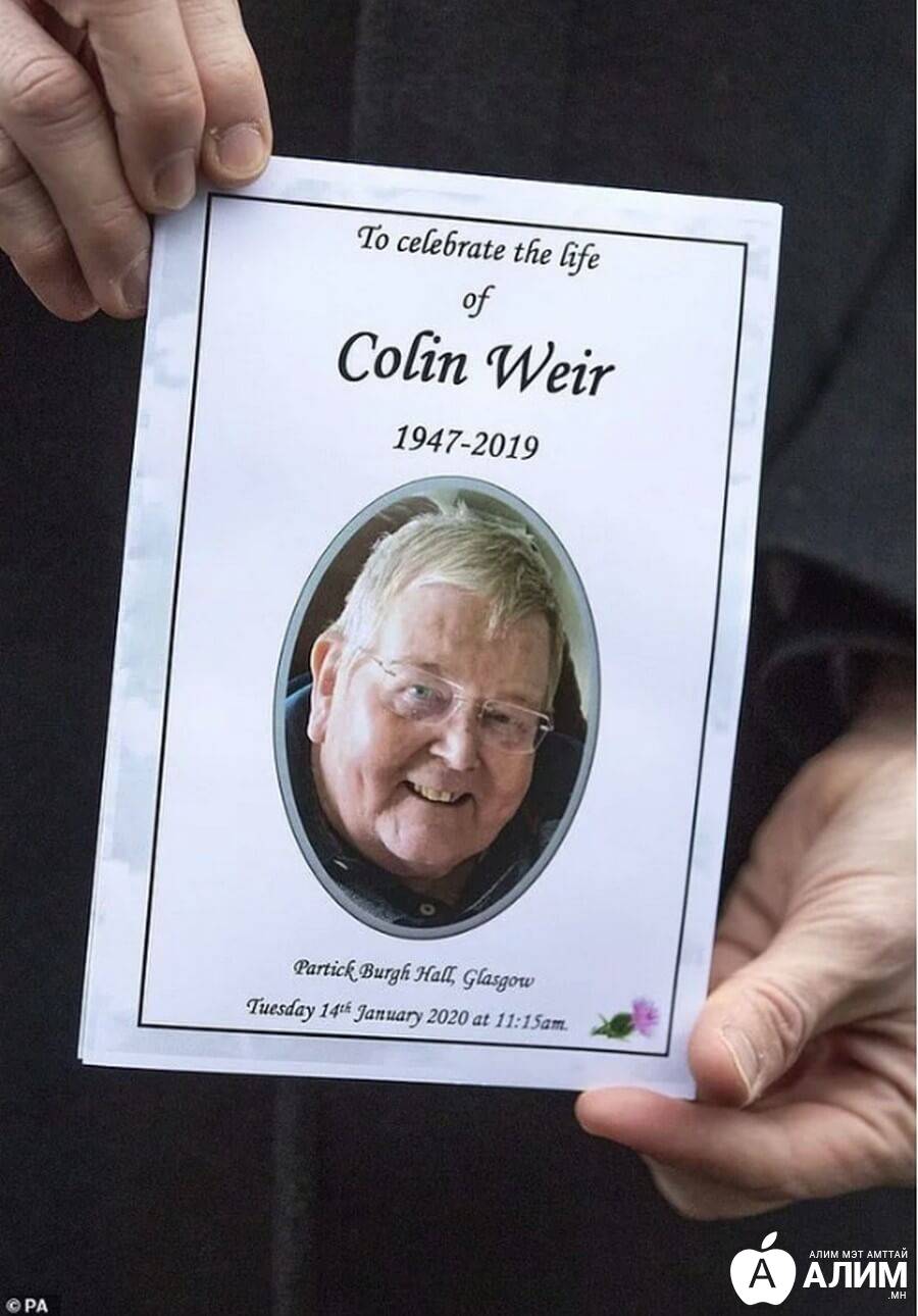 Англи иргэн Колин Вейр 2011 онд 71 насандаа EuroMillions сугалаанаас 161 сая фунт хожсон. Энэ нь монгол мөнгөөр 5,7 тэрбум төгрөгтэй тэнцэнэ. Хүнд өвчинд шаналж байсан тэрээр хонжворын мөнгөө тун өвөрмөц байдлаар зарцуулжээ. Хамгийн эхлээд өөрийн дэмждэг хөлбөмбөгийн “Partick Thistle” багийнхаа хувьцааг худалдан авчээ. Мөн эхнэр хүүхэддээ хувь өгсөн байна. Гэхдээ амьдрах хугацаа багахан үлдсэн гэдгийг мэдэж байсан тул хонжворынхоо үлэмжхэн хэсгийг өөрийн оршуулгадаа зарцуулахаар шийджээ. Амьдралынхаа сүүлчийн өдрүүдэд эхнэрийн хамт Шотландын Тернберри хот дахь тансаг зэрэглэлийн “A Trump Turnberry hotel” зочид буудалд амьдарч “Turnberry” гольфийн талбайд гольф тогложээ. Энэ амралт зугаалгын төв нь Америкийн ерөнхийлөгч Дональд Трампын компанийх агаад дэлхийн баячууд ирж амардаг. 2019 оны 12-р сарын сүүлээр Колин Вейр нас барсан. Оршуулга нь 2020 оны 1-р сарын 14-нд болж эцсийн замд нь “A Trump Turnberry hotel” зочид буудлаас лимузин машинаар гаргасан. Чандарлах үйлчилгээ, авс, цэцгийн тухайд хамгийн үнэтэйг нь сонгожээ. Томчуудад үйлчилдэг буяны компаний “вип” үйлчилгээг мөн сонгон авчээ. Оршуулгын цуваа талийгаачийн хувьцааг нь эзэмшдэг хөлбөмбөгийн “Partick Thistle” багийн “Energy Check” цэнгэлдэх хүрээлэнгийн өмнө саатахад тамирчид багийнхан хүндэтгэл үзүүлжээ. Талийгаачийн буяны цайллага “Trump Turnberry” хүндэтгэлийн зааланд болжээ. Буяны ажилд оролцсон хүмүүсд хамгийн тансаг үнэтэй хоол, зууш ундаагаар үйлчилжээ. Ширээ болгонд нэг бүр нь 340 фунт буюу 1,2 сая төгрөгийн үнэтэй дээд зэрэглэлийн дарс задалжээ.