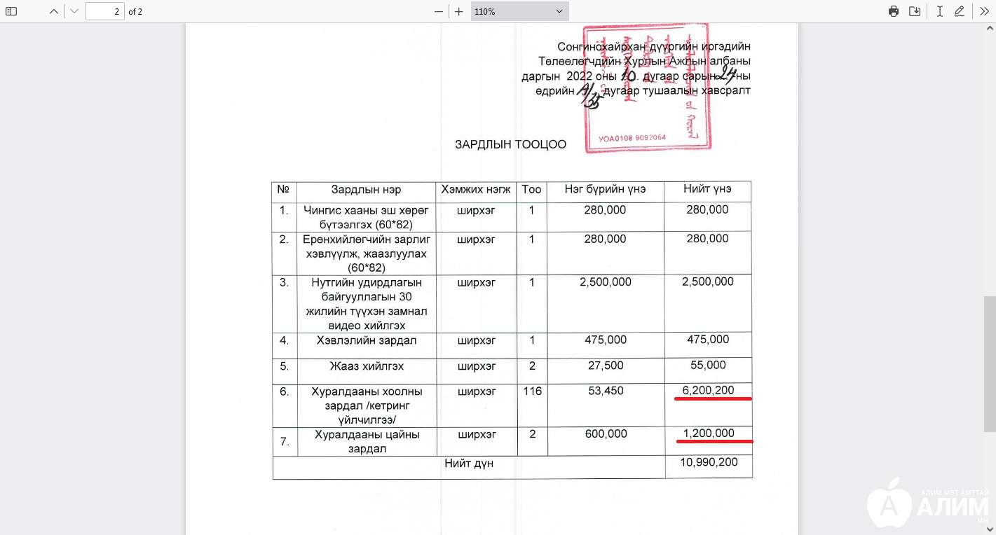 Өнгөрсөн намар Чингэлтэй болон Сонгинохайрхан дүүрэг байгуулагдсаны 30 жилийн ой нижгэр болсон. Нижгэр болсоныг нь дүүргийн иргэд мэдээгүй ч дарга нар нь тансаглаад дууссаныг гаргасан зардал нь харуулж байна. Сонгинохайрхан дүүрэг үүсэн байгуулагдсаны 30 жилийн ойд зориулсан хүндэтгэлийн хурал хэмээх тансаг арга хэмжээ ИТХ-д болжээ. Уг хуралд 10,9 сая төгрөг төсөвлөсөн нь гар татаагүйг харуулж байна. Төсвийн задаргааг харахад хуралдаж сүртэй юм бололгүйгээр хөрөг залаад, бичлэг үзээд үлдсэн цагт нь идэж уусан аж. Чингис хааны иш хөрөг болон Ерөнхийлөгчийн зарлигийг жаазалж өлгөхөд хагас сая төгрөг зарцуулжээ. Дараа нь 2,5 сая төгрөгөөр бүтсэн өөрсдийнхөө тухай бичлэгийг үзээд зоогийн ширээний ард суужээ. Хоолны зардалд 6,2 төгрөг зарцуулсан нь хурлын төсвийн талаас илүү хувь болсон. Сая саяын үнэтэй хоол гэхээр ямар зоог байх нь ойлгомжтой. Өмнөх ИТХ-ын үед төлөөлөгчид гахайн шарсан хавирга зэрэг дээдсийн хоол авчруулж иддэг байсан гэхээр энэ удаад түүнээс илүү гарсан нь ойлгомжтой. Түүнийг нь дүүргийн жирийн иргэдийн хоолтой харьцуулбал тэнгэр газар шиг зөрүүтэй. ИТХ-ын төлөөлөгчид ингэж тансаг хооллоод араас нь 1,2 сая төгрөгний үнэтэй цай ууцгаасан байна. Сая илүү төгрөгөөр цай уусан гэдгийг нь цайны сүүгүй ч суугаа дүүргийн эмгэд хөгшид сонсоод ухаан алдах биз ...