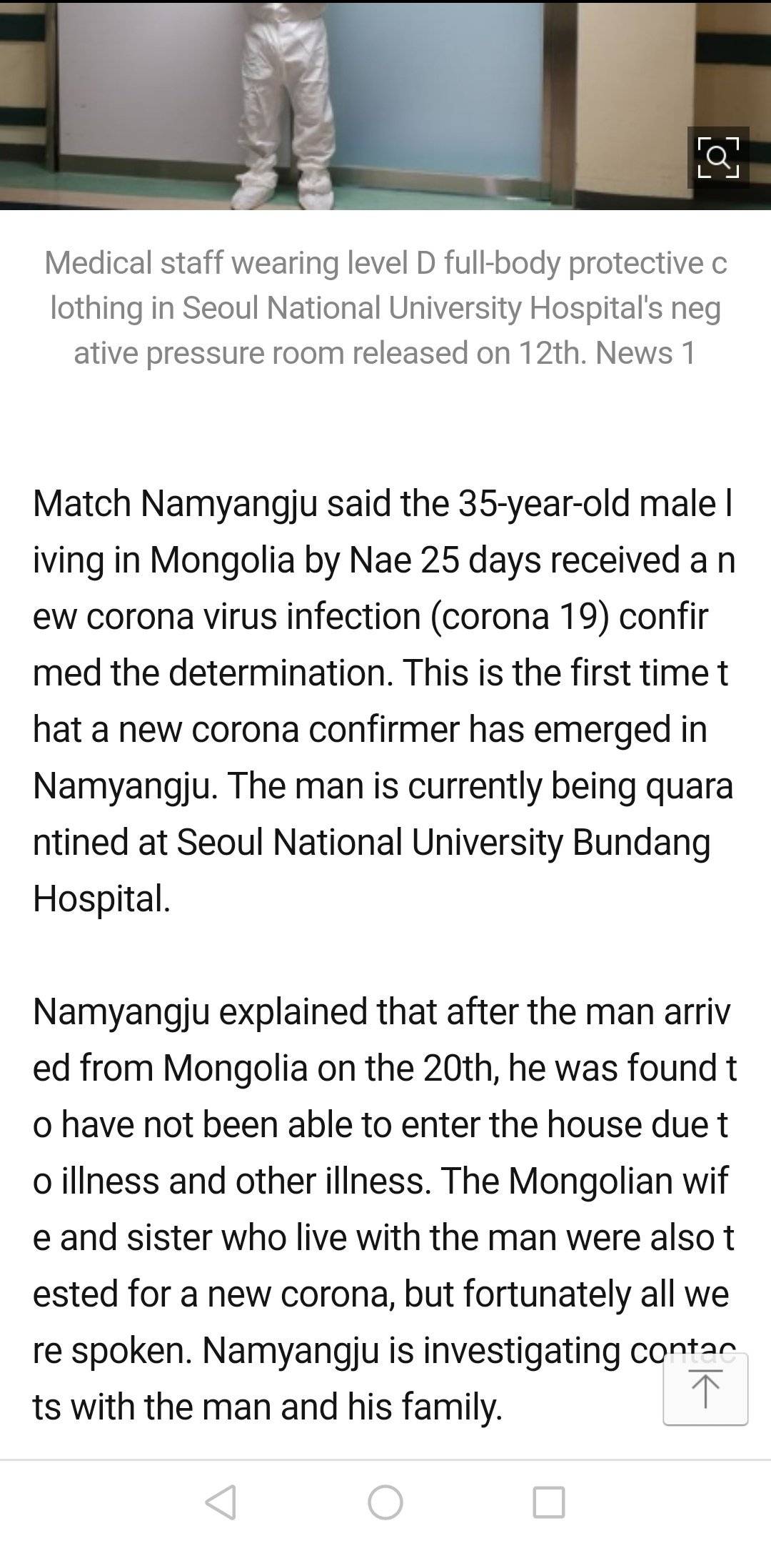 Солонгос улсад үхлийн аюултай коронавирусын халдвар, өвчлөл хүчтэй тархаж аюулт байдлаараа Хятадын дараа ороод байна. Тэгвэл тус улсын Намянгжү хотод анхны халдвар тээгч бүртгэгджээ. Шинжилгээгээр тус хотод амьдардаг Монгол Улсын 35 настай иргэн халдвар авсан нь тогтоогдож тусгаарлагдсан тухай Солонгосын хэвлэл мэдээлжээ. Уг мэдээллээр халдвар тээгч нь энэ сарын 20-ны өдөр Монголоос иржээ. Түүний эхнэр болон эгчийг мөн халдвар тээгч хэмээн үзэж тусгаарлаж тэдэнтэй хавьтагчдийн хүрээг тогтоох ажиллагаа хийгдэж байна. Болсон явдал уг өвчин монгол хүнд тусахгүй гэх зэргээр нэлээд тарсан буруу ойлголтыг бүрэн няцааж байна.